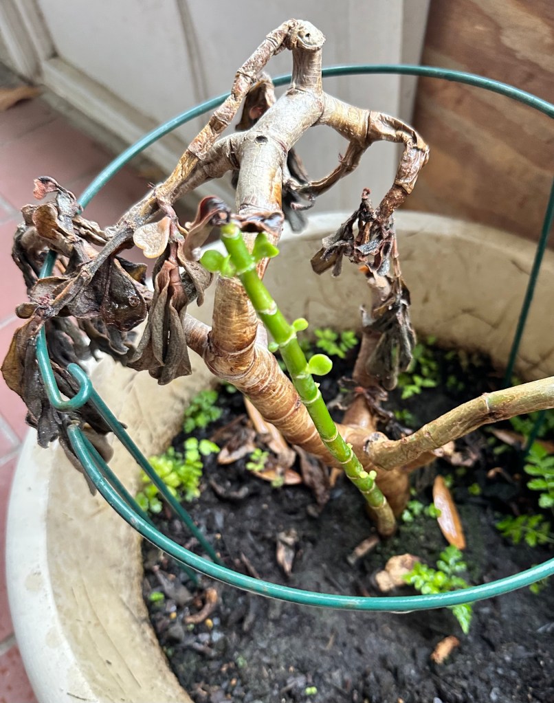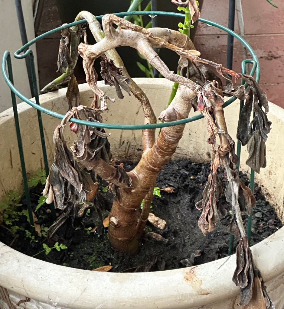 It is not that I do not love the other plants I have, because I do! But those two Audrey and mom’s plant were the most special, which made it so painful to see them in the state they were after the cold this year. Audrey did not completely succumb to the cold, but she was in bad shape, and my mom’s plant, for all intents and purposes, was dead. The cold had been too long and too brutal for my plants. The situation seemed beyond hope. As far as I could see, they were dead and were not coming back. I was devastated.